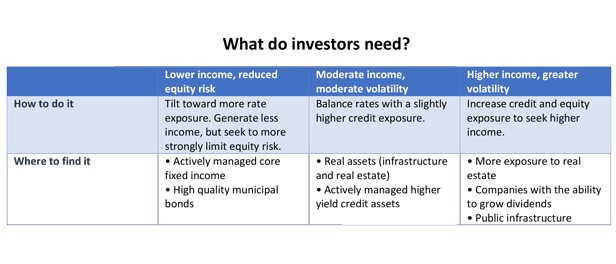 Investing into a broader array of fixed income securities, dividend-paying equities, and alternatives such as real assets and private credit is likely required.