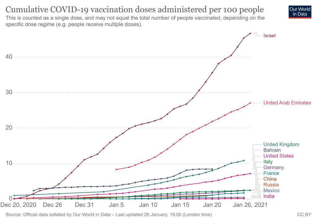 More than 68 million vaccine doses had been administrated in 56 countries by late January 2021. The daily rate is approximately 3.4 million doses a day. Israel is leading with 43% of their population vaccinated. America has given out 23.5 million doses, 7.1% of their population.